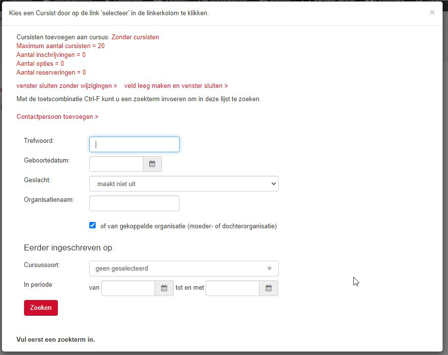 Bij 'Cursisten toevoegen aan cursus' is een extra filtermogelijkheid toegevoegd in ChainWise Cursusplanner. Hiermee kan gezocht worden op eerdere inschrijvingen voor een bepaalde cursussoort en binnen een bepaalde periode. De lijst met cursisten wordt daarop dan gefilterd.